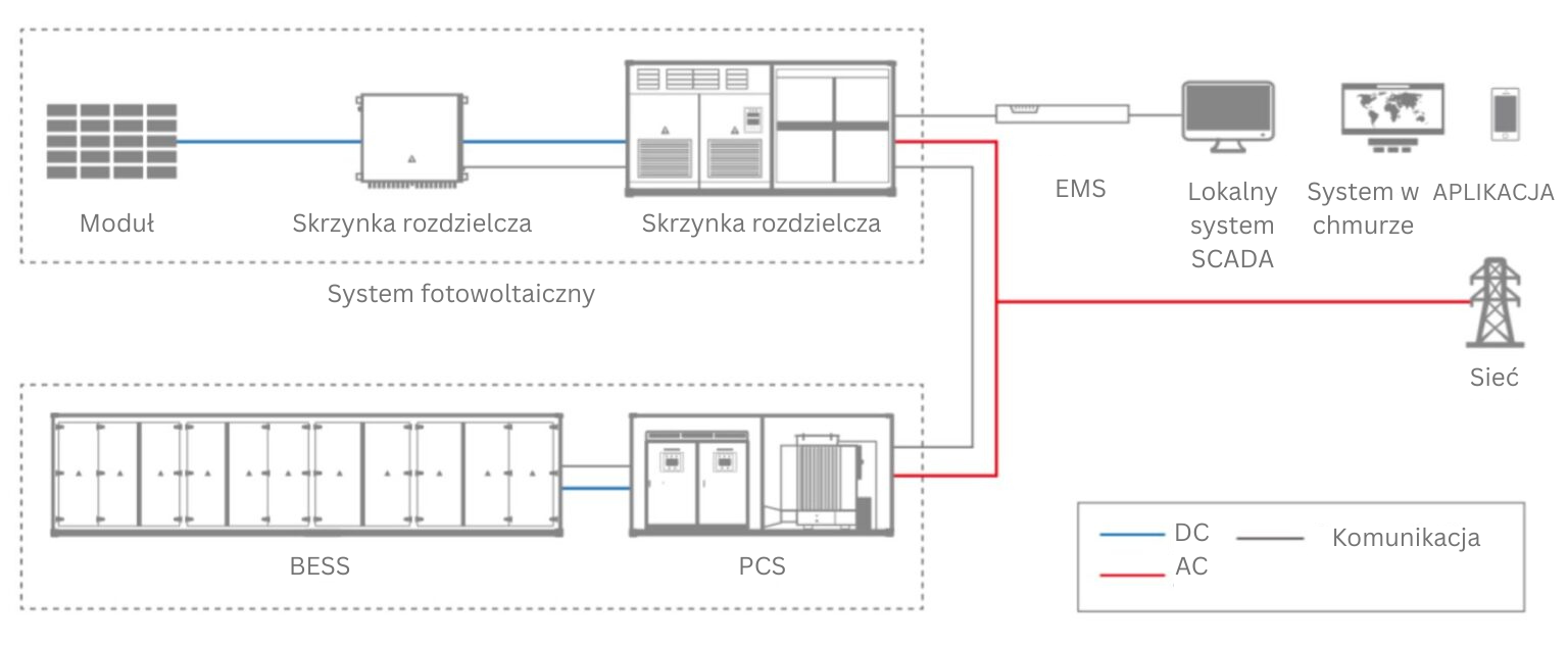 Kluczowe komponenty systemu BESS (Battery Energy Storage System) obejmują moduły lub ogniwa akumulatorowe magazynujące energię elektryczną, falowniki przekształcające prąd stały (DC) z akumulatorów na prąd przemienny (AC) do użytku sieciowego, system zarządzania akumulatorami (BMS) monitorujący i zarządzający stanem akumulatorów, systemy zarządzania termicznego regulujące temperaturę i zapewniające bezpieczeństwo, systemy konwersji energii do efektywnego przesyłu energii oraz systemy sterowania koordynujące działanie, mechanizmy bezpieczeństwa i interfejsy komunikacyjne do bezproblemowej integracji z siecią.