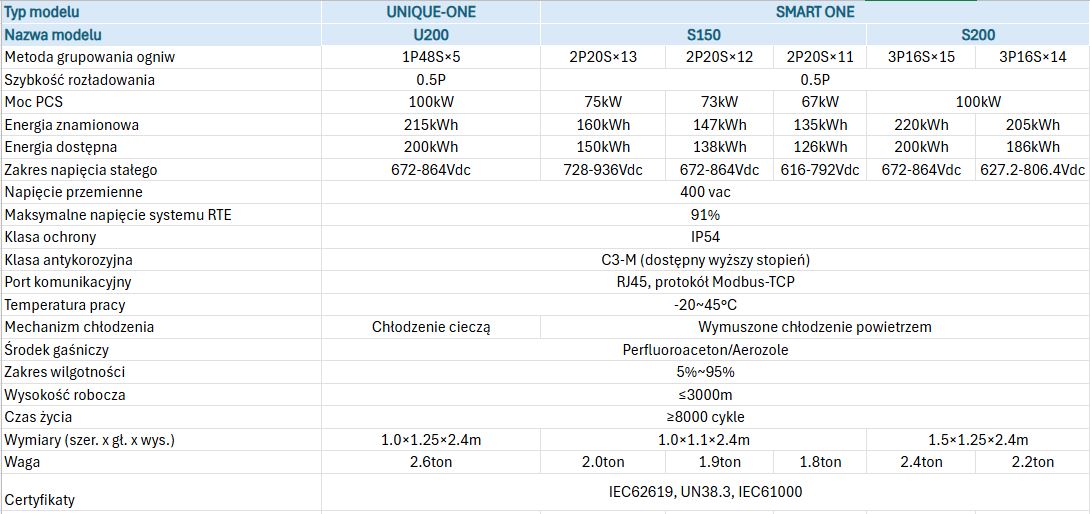 - Pojemność pojedynczego kontenera 3,42MWh, 4,56MWh, 5MWh